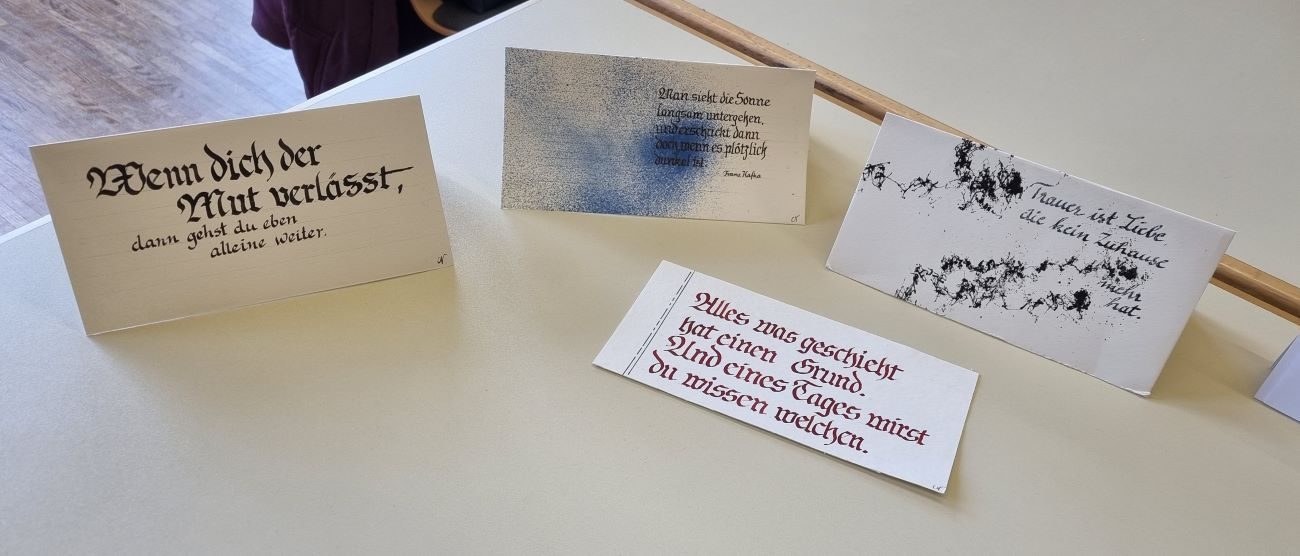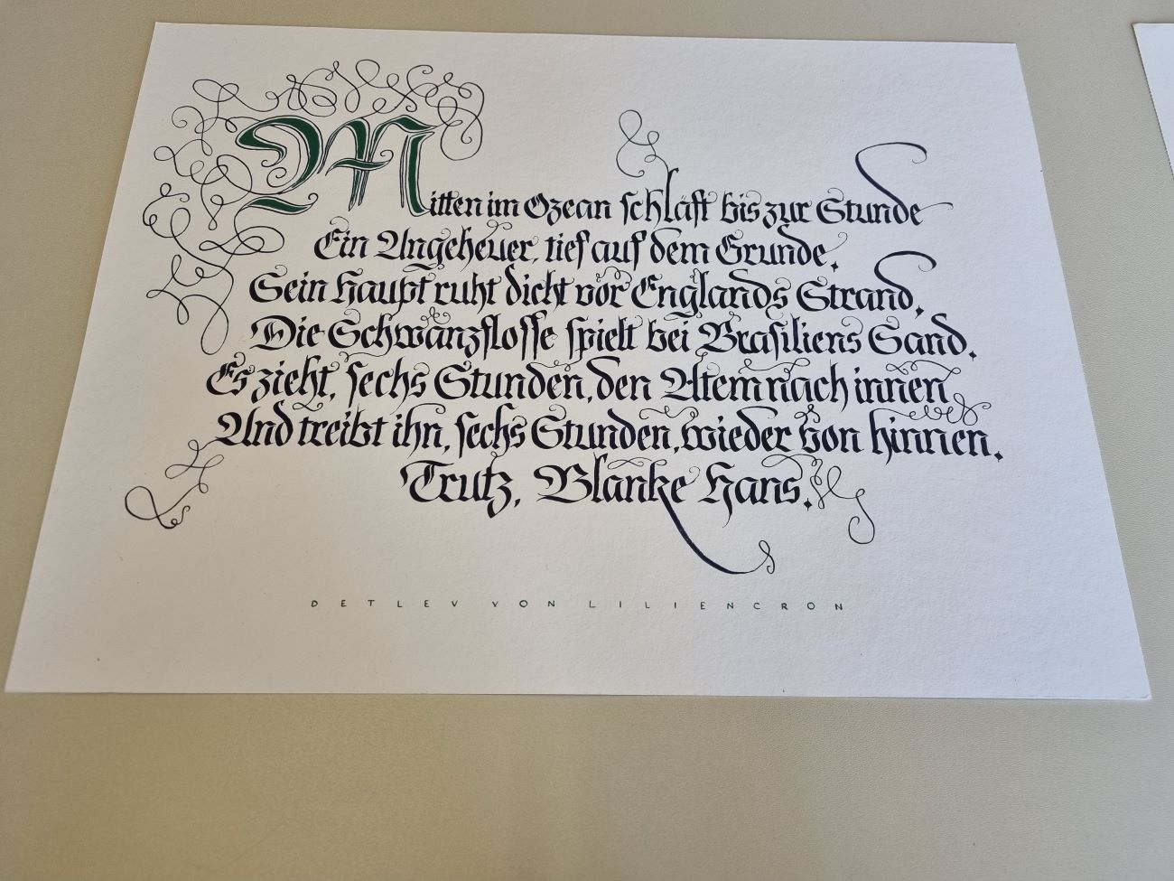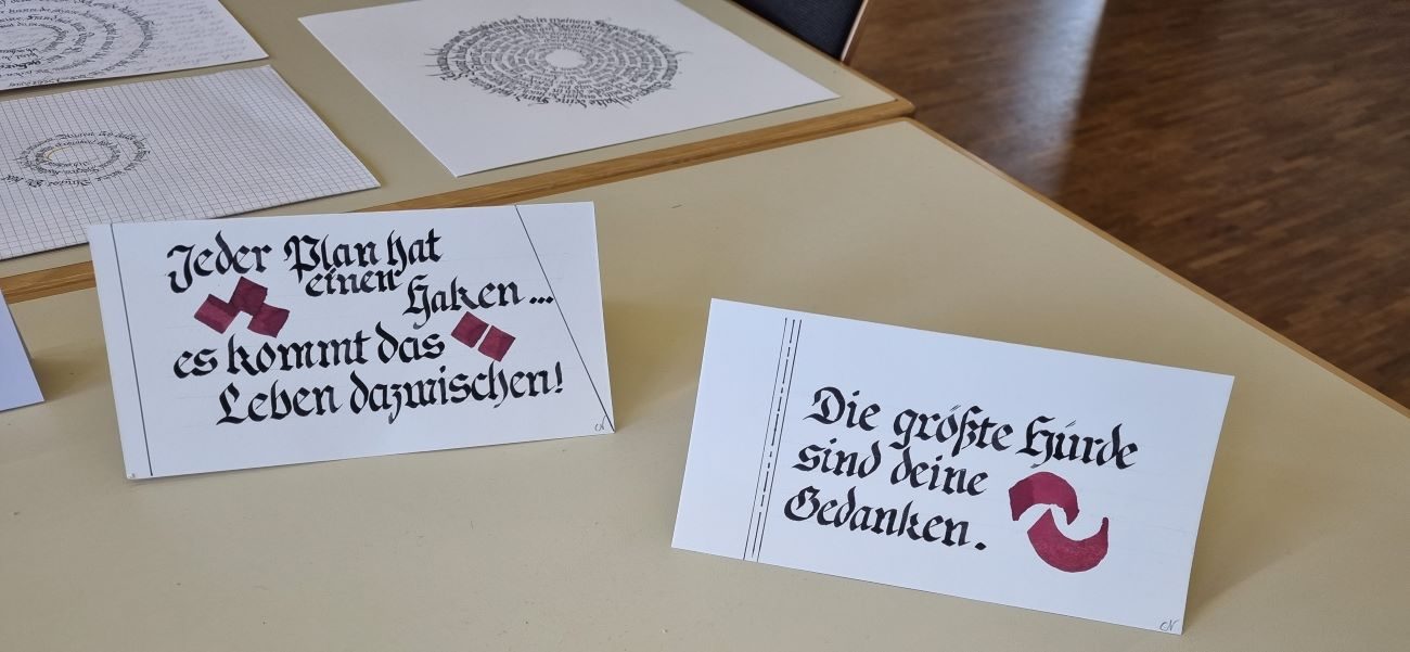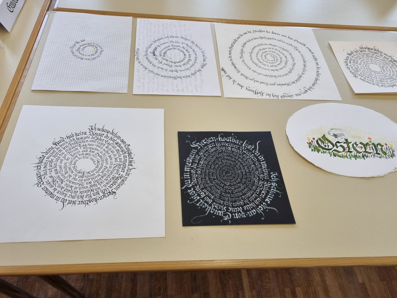 Fraktur – Grundlagen, Variation und Verzierung, war das Thema der Kalligrafiewoche im März. Es entstanden kunstgerechte Arbeiten unter Anleitung des Kalligrafen Thomas Hoyer.