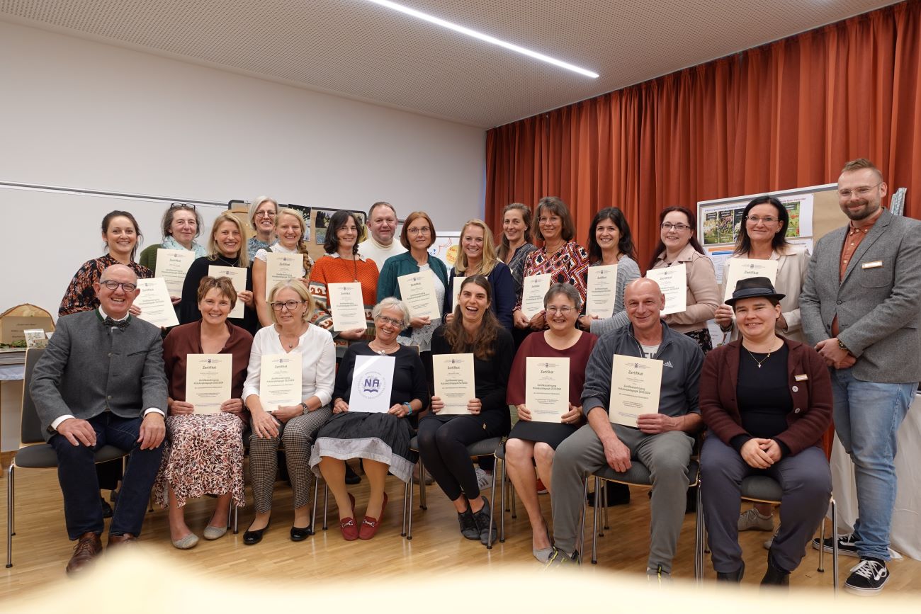 Mit der Entgegennahme der Abschlusszertifikate aus der Hand von Barbara J. Th. Schmidt, Leiterin der Landvolkshochschule Niederalteich, und Kursleiter Stefan Köberl, Bildungsreferent für Landwirtschaft und Ökologie erlebten die Absolventinnen und Absolventen auch eine Premiere. Das neue Logo „Niederalteicher Kräuterpädagogen“ wurde präsentiert. „Mit dem Logo festigen wir unser Wildpflanzen-Netzwerk auf der Basis von Schöpfungsverantwortung, Pflanzenwissen und Nachhaltigkeit“, betonte Barbara J. Th. Schmidt. Das Logo wurde von Franziska Fruhstorfer, Grafikerin aus Ried im Innkreis gestaltet.
