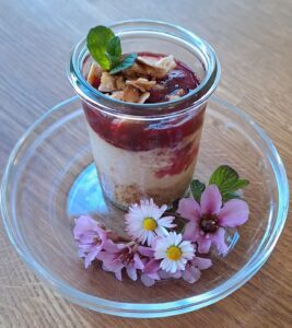 Laden Sie sich unser Rezept von dem Käsekuchen im Glas mit Himbeeren herunter.