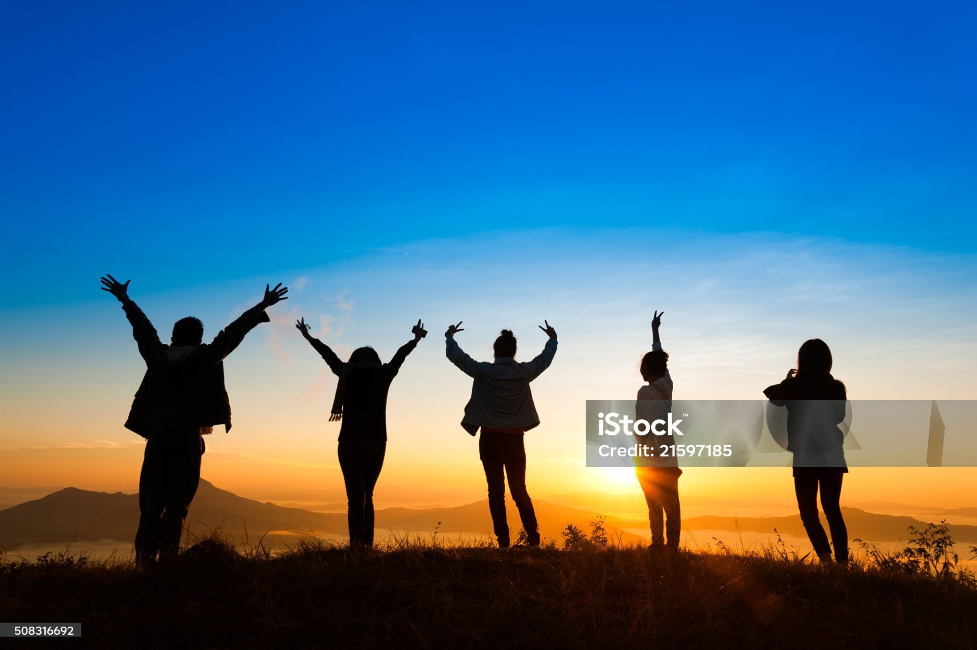Landscape view of sunrise on misty mountain hills with women and man silhouette, phatang mountain Chiangrai Thailand